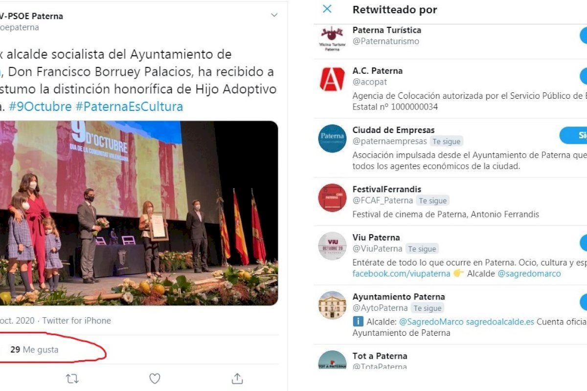 Argumenten fonts de la formació que d’un temps fins hui s’han anat creant un nombre exagerat de perfils “institucionals” com el de Paterna Ciudad de Empresas, del Festival Antonio Ferrandis, de la nova revista propagandística de l’equip de govern nomenada Tot a Paterna i així uns quants més, “uns perfils que tenen com a única activitat repiular o compartir les publicacions que es realitzen des de l’ampli equip d’assessors de comunicació del que disposa Sagredo en Ajuntament i en Gespa. “Per ficar un exemple, estem immersos en la setmana on es desenvolupa el festival de cinema Antonio Ferrandis, pues bé, assoles hi ha 3 publicacions fent referència al festival i la resta són publicacions compartides de Sagredo, del govern municipal o inclòs del Psoe”.